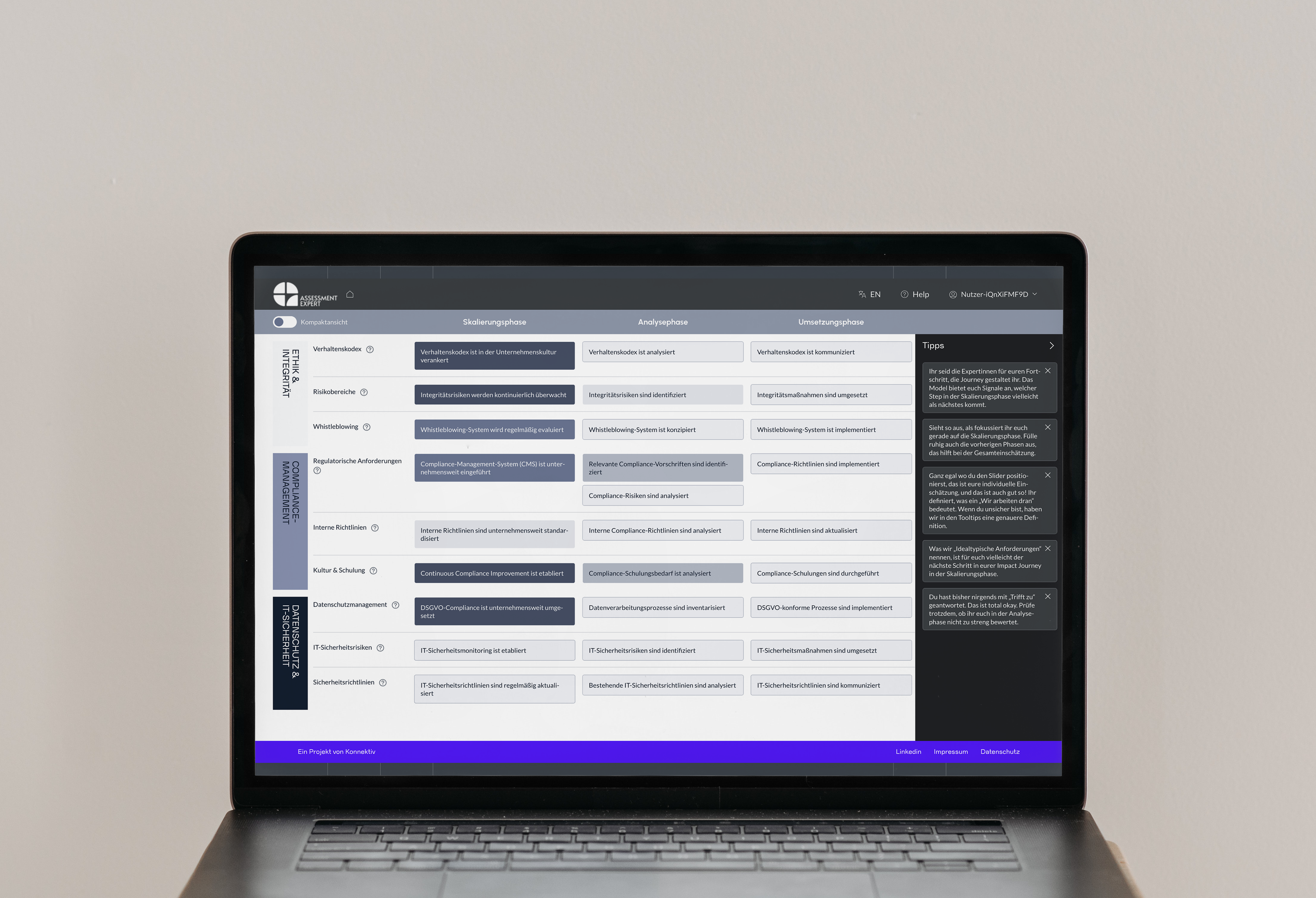 Sie können dabei die Taxonomie Ihres eigenen Assessments im Backend hinterlegen und auf vielfältige Art und Weise konfigurieren, so dass der Assessment Expert genau auf Ihren Anwendungsfall passt.